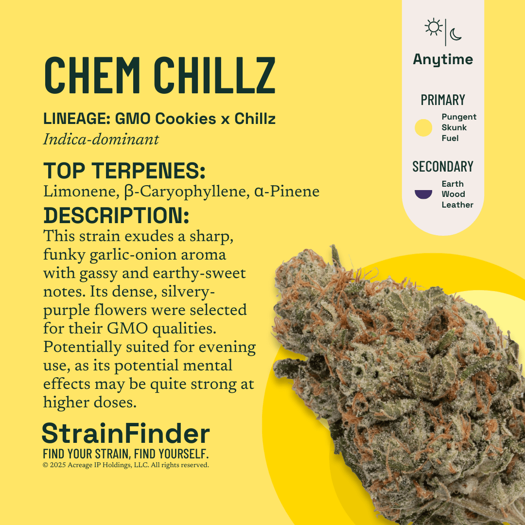 This strain exudes a sharp, funky garlic-onion aroma with gassy and earthy-sweet notes. Its dense, silvery-purple flowers were selected for their GMO qualities. Potentially suited for evening use, as its potential mental effects may be quite strong at higher doses.