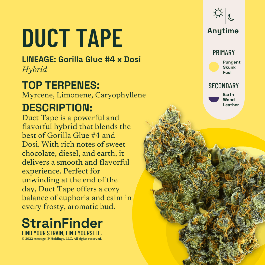 Duct Tape is a potent hybrid bred by Archive Seeds. It delivers a rich chem chocolate and earthy Bubba aroma with hints of incense and kush. The Dosi influence shows in its short stature, dense structure, and oversized trichomes. Expect thick, flavorful smoke and a terpene profile of 2%+.