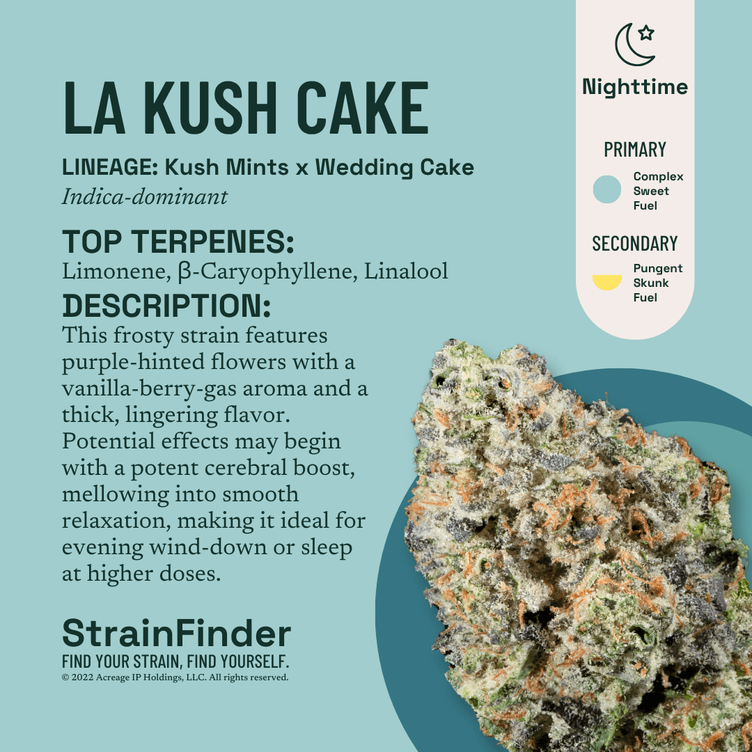 This frosty strain features purple-hinted flowers with a vanilla-berry-gas aroma and a thick, lingering flavor. Potential effects may begin with a potent cerebral boost, mellowing into smooth relaxation, making it ideal for evening wind-down or sleep at higher doses.