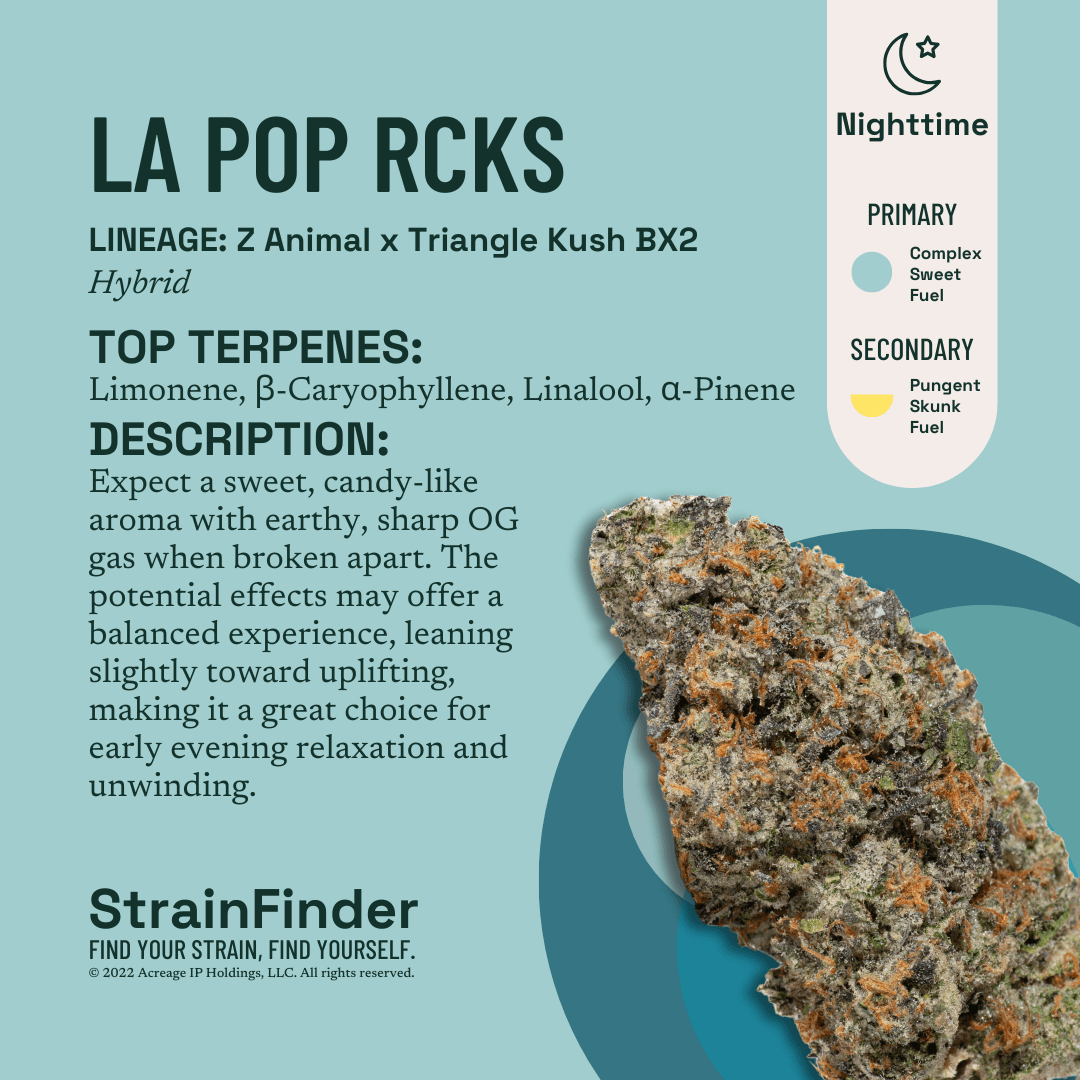 Expect a sweet, candy-like aroma with earthy, sharp OG gas when broken apart. The potential effects may offer a balanced experience, leaning slightly toward uplifting, making it a great choice for early evening relaxation and unwinding.