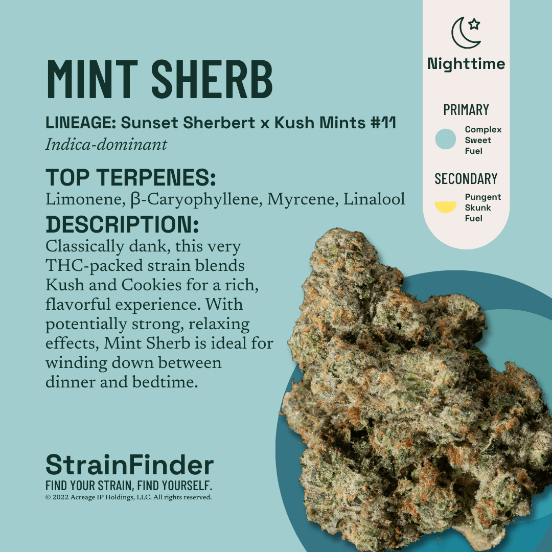Classically dank, this very THC-packed strain blends Kush and Cookies for a rich, flavorful experience. With potentially strong, relaxing effects, Mint Sherb is ideal for winding down between dinner and bedtime.