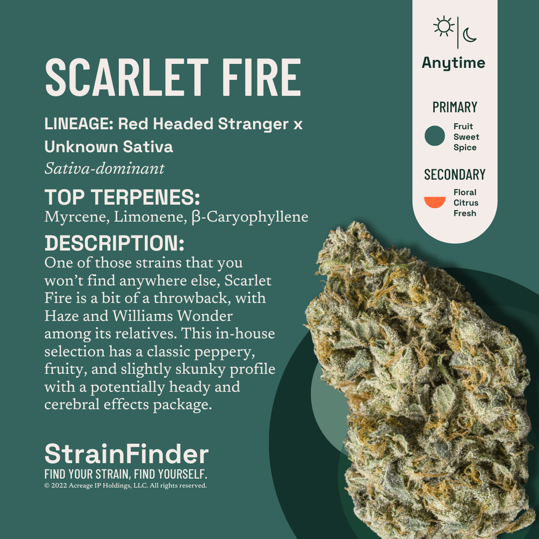 One of those strains that you won’t find anywhere else, Scarlet Fire is a bit of a throwback, with Haze and Williams Wonder among its relatives. This in-house selection has a classic peppery, fruity, and slightly skunky profile with a potentially heady and cerebral effects package.